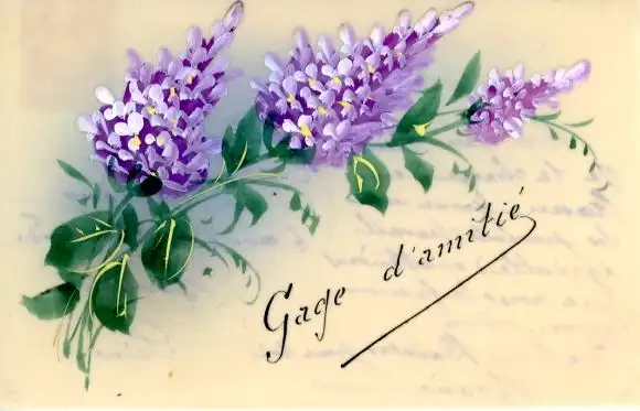Zelluloid Ak Blühende violette Blumen, Kitsch