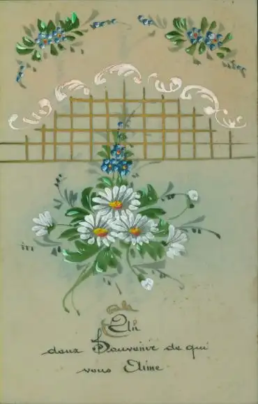 Zelluloid Ak Blumen, Margeriten, Vergissmeinnicht