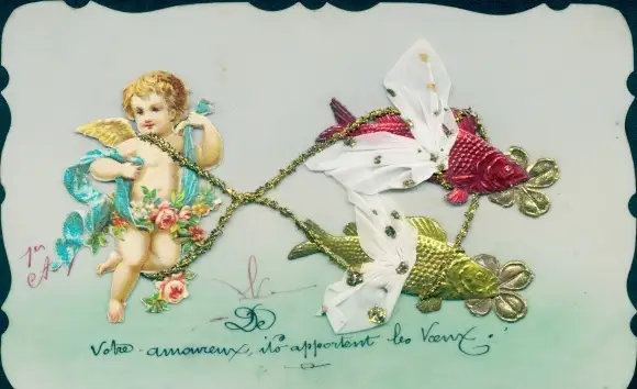 Zelluloid Ak Engel, Fische, Blumen, Glückwunsch, Kitsch