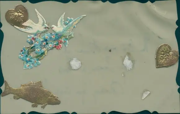 Zelluloid Ak Fisch, Herzen, Tauben, Vergissmeinnicht