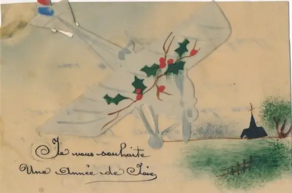 Zelluloid Ak Flugzeug, Stechpalme, Kirche, Kitsch