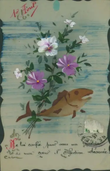 Zelluloid Ak Glückwunsch 1. April, Fisch, Blumenstrauß