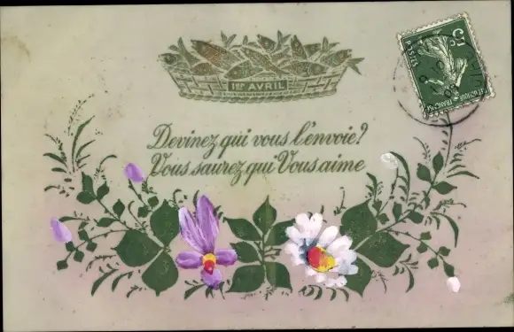 Zelluloid Ak Glückwunsch 1. April, Fische, Blumen
