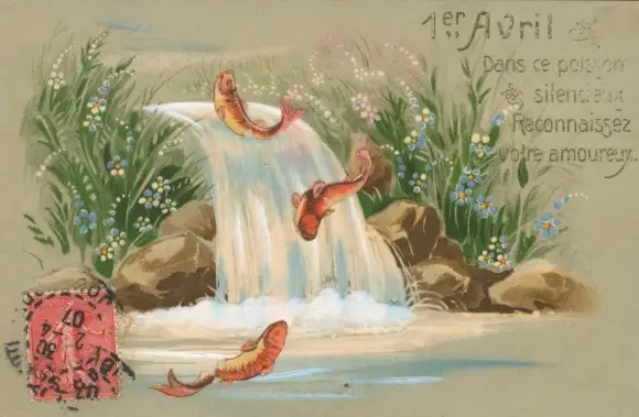 Zelluloid Ak Glückwunsch 1. April, Fische, Wasserfall