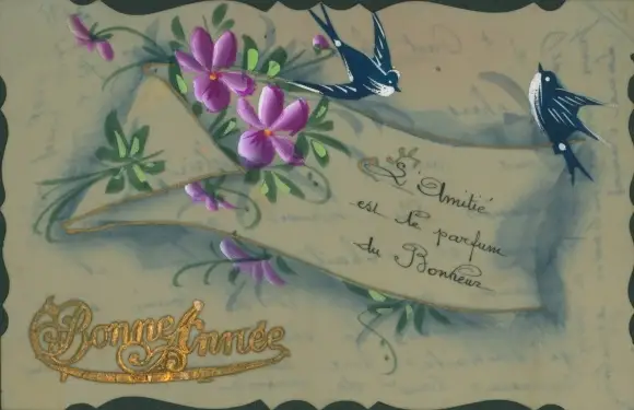 Zelluloid Ak Glückwunsch Neujahr, Blumen, Schwalben