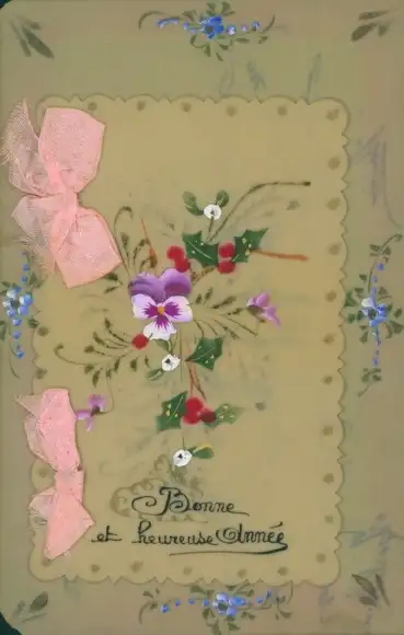 Zelluloid Ak Glückwunsch Neujahr, Blumen, Stoffschleifen