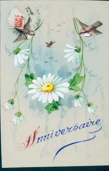 Zelluloid Ak Kitsch, Blumen, Spatzen, Margeriten