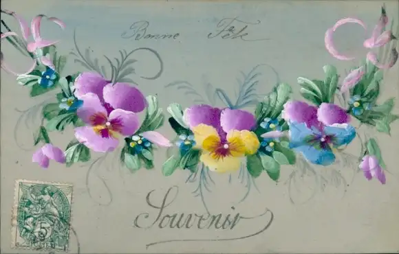 Zelluloid Ak Kitsch, Blumen, Stiefmütterchen, Souvenir