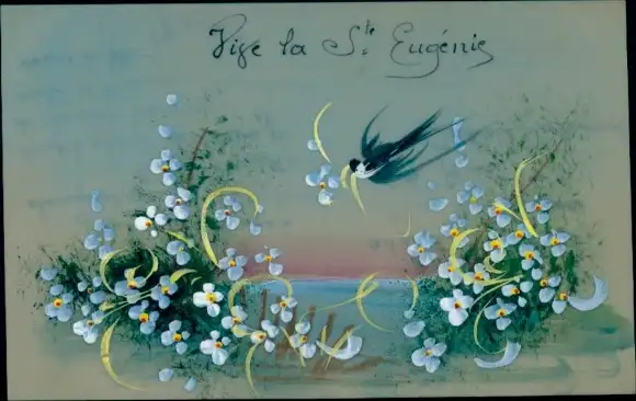 Zelluloid Ak Kitsch, Blumen, Vergissmeinnicht, Schwalbe