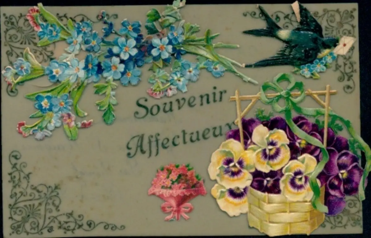Zelluloid Ak Kitsch, Blumenkorb, Schwalbe
