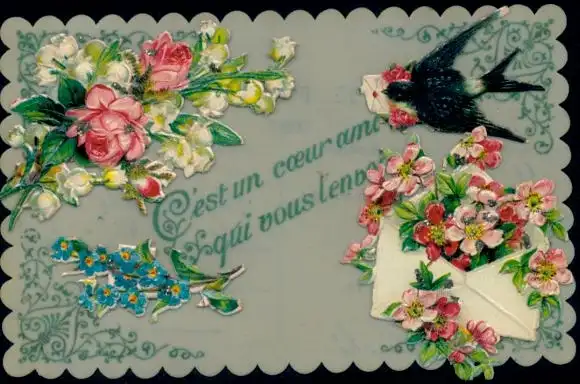 Zelluloid Ak Kitsch, Schwalbe, Blumen