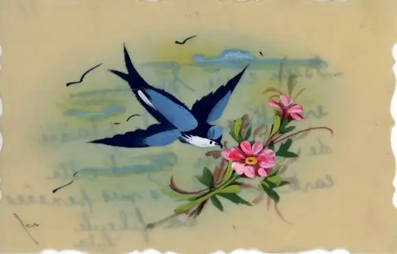 Zelluloid Ak Kitsch, Schwalbe, Blumen