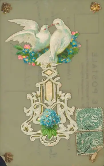 Zelluloid Ak Kitsch, Tauben, Vergissmeinnicht