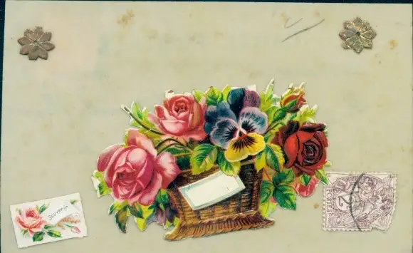 Zelluloid Ak Korb mit Rosen und Stiefmütterchen