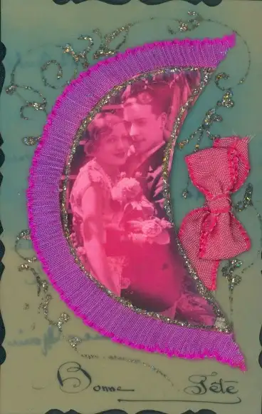 Zelluloid Ak Liebespaar, Blumen, Stoffschleife