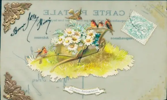 Zelluloid Ak Schubkarre, Margeriten, Vögel, Kitsch