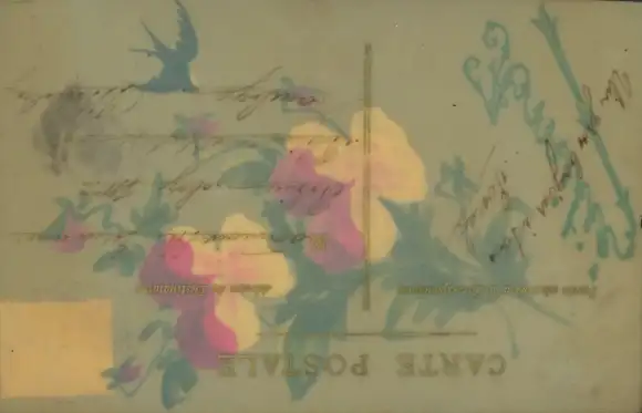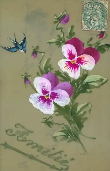 Zelluloid Ak Stiefmütterchen, Schwalbe, Kitsch