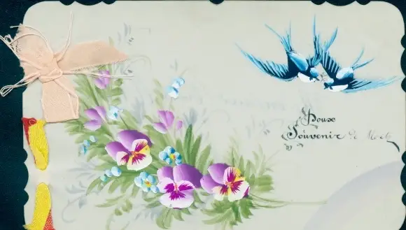 Zelluloid Ak Stiefmütterchen, Vergissmeinnicht, Schwalben, Stoffschleife
