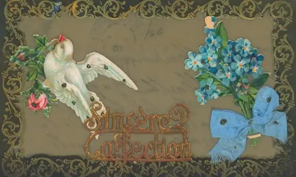 Zelluloid Ak Taube, Blumen, Stoffschleife, Vergissmeinnicht