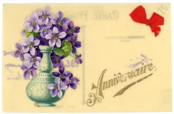 Zelluloid Ak Veilchen in der Blumenvase, Stoffschleife