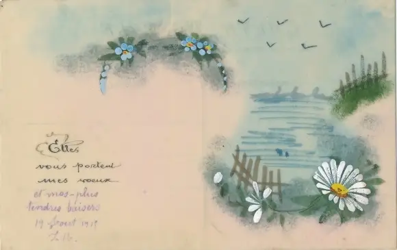Zelluloid Ak Vergissmeinnicht, Margeriten, Fluss, Vögel