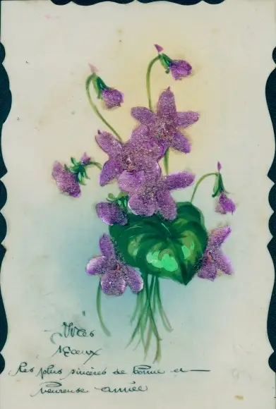 Zelluloid Ak Violette Blumen, Blumenblatt