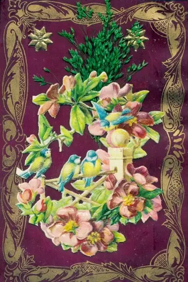 Zelluloid Ak Vögel, Vogelhäuschen, Blumen