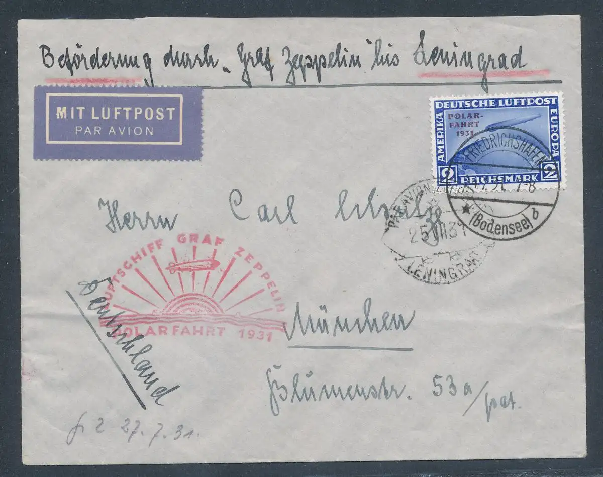 Zeppelin-Brief mit EF. Polarfahrt DR. Mi.-Nr. 457, sign. SchlegelBPP.