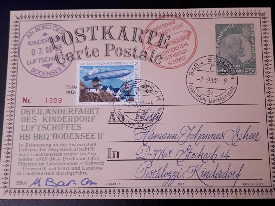 Zeppelinpost Dreiländerfahrt Kinderdorf Luftschiff Bodensee II 1988 Liechtenstein Schweiz Österreich