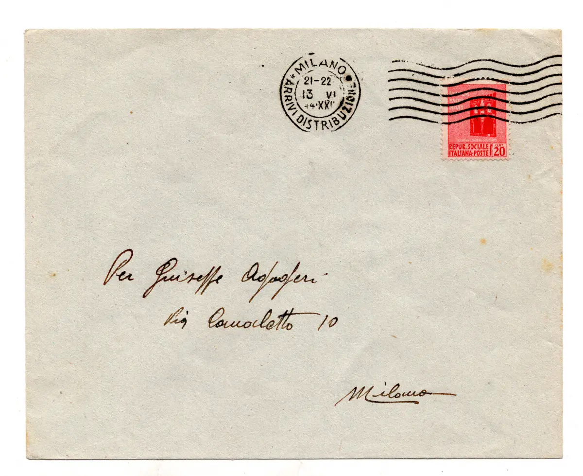 Zerstörte Denkmäler Cent. 20 Block auf Umschlag - Zerstörte Denkmäler Cent. 20 Nr. 496 isoliert auf Umschlag von Mailand pro Stadt am 13.6.44 - nicht im Tarif aber trotzdem ungewöhnlich Nr. 354/20