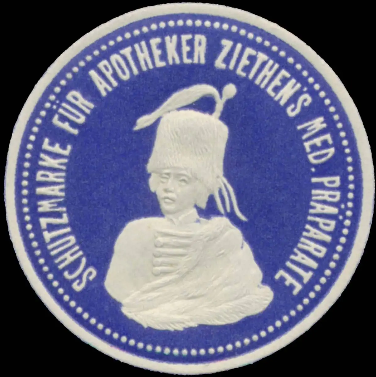 Schutzmarke für Apotheker Ziethens med. Präparate, Apotheke, Ziethen, Größe/Zustand: 4 , guter Zustand, Original alte Reklamemarke die seinerzeit für die Werbung benutzt wurde