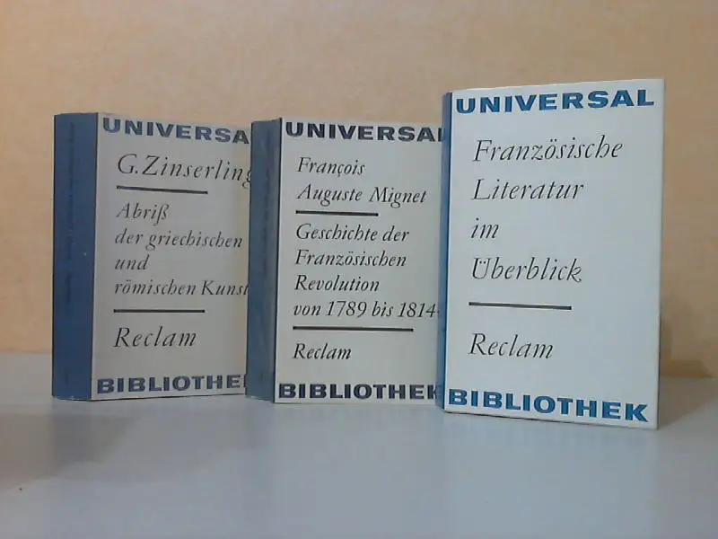 alle 3 Bücher das Buch stammen aus einer Haushaltsauflösung, gebräunt, fleckig, aus dem Inhalt: Reclams Universal-Bibliothek Band 422, Französische Literatur im Überblick: DIE LITERATUR DES MITTELALTERS (9.-15. Jahrhundert) - DIE RENAISSANCE - DIE KLASSIK - DIE AUFKLÄRUNG (SIEGLE DES LUMIERES) (1715-1789) - ROMANTIK UND KRITISCHER REALISMUS - DIE LITERARISCHE ENTWICKLUNG - DER LETZTEN JAHRZEHNTE - DES 19. JAHRHUNDERTS - VOM 19. ZUM 20. JAHRHUNDERT - ZWISCHEN ZWEI KRIEGEN - NACH DEM ZWEITEN WELTKRIEG - Bibliographie - Autorenregister. Reclams Universal-Bibliothek Band 594, Geschichte der Französischen Revolution von 1789-1814: Zum Charakter der französischen Revolution; ihr Verlauf und ihre Ergebnisse - Kurzer Abriß der Entwicklung der Monarchie - Ludwig X/V. und Ludwig XV. - Über die Stimmung in der Bevölkerung, den Zustand der Finanzen, der Staatsgewalt und der öffenthchen Angelegenheiten bei der Thronbesteigung Ludwig XVI. - Sein Charakter - Der Erste Minister Maurepas und seine Taktik - Über seine Absicht bei der Berufung populärer und reformfreudiger Minister - Turgot, Malesherbes, Necker und ihre Pläne - Sie treffen auf die Opposition des Hofes sowie der Privilegierten und scheitern - Der Tod Maurepas` - Über den Einfluß der Königin Marie-Antomette - Höflinge folgen den populären Ministern im Amt - Das System Calonnes; Charakter und Ziele Briennes - Über die Finanzkrise - Unruhe in den Provinzen, Opposition in der Sitzung der Notabein und im Parlament - Entlassung Briennes und zweites Ministerium Neckers- Die Einberufung der Generalstände - Wie die Revolution herbeigeführt wurde. Reclams Universal-Bibliothek Band 435, Abriss der griechischen und römischen Kunst: Die ältesten europäischen Hochkulturen im zweiten Jahrtausend v.u.Z. - Die Anfänge griechischer Kunst in geometrischer Zeit (11.-8. Jh. v.u.Z.). - Die archaische Kunst im Zeitalter des sich entwickelnden griechischen Stadtstaates ; (7. u. 6. Jh. v.u.Z.) - Der Höhepunkt der griechischen Kunstentwicklung im 5. Jh. v.u.Z. - Die Kunst des 4. Jh. v.u.Z. - Die Kunst des Hellenismus - Die etruskisch-mittelitalische Kunst - Die Anfänge römischer Kunst in spätrepublikanischer Zeit - Die Kunst der römischen Kaiserzeit - Bildteil (Abb. 27-193) Beschreibung vom Antiquariat Ardelt 4k6a Antiquariat Ardelt