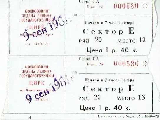 sehr guter Zustand, Gebrauchs- und Alterungsspuren: Ränder teils leicht knittrig - Eintrittskarten knittrig und geknickt, Zirkus-Programmheft aus der Sowjetunion vom 7. August 1981 + 2 benutzte Eintrittskarten Programm: Pantomime "Ruslan und Ljudmila" Künstlerischer Leiter der Aufführung: Jewgeni Timofejewitsch Milajew (1910-1983), Papier, ca. 12 x 25,5, 3 Seiten + 2 Eintrittskarten
