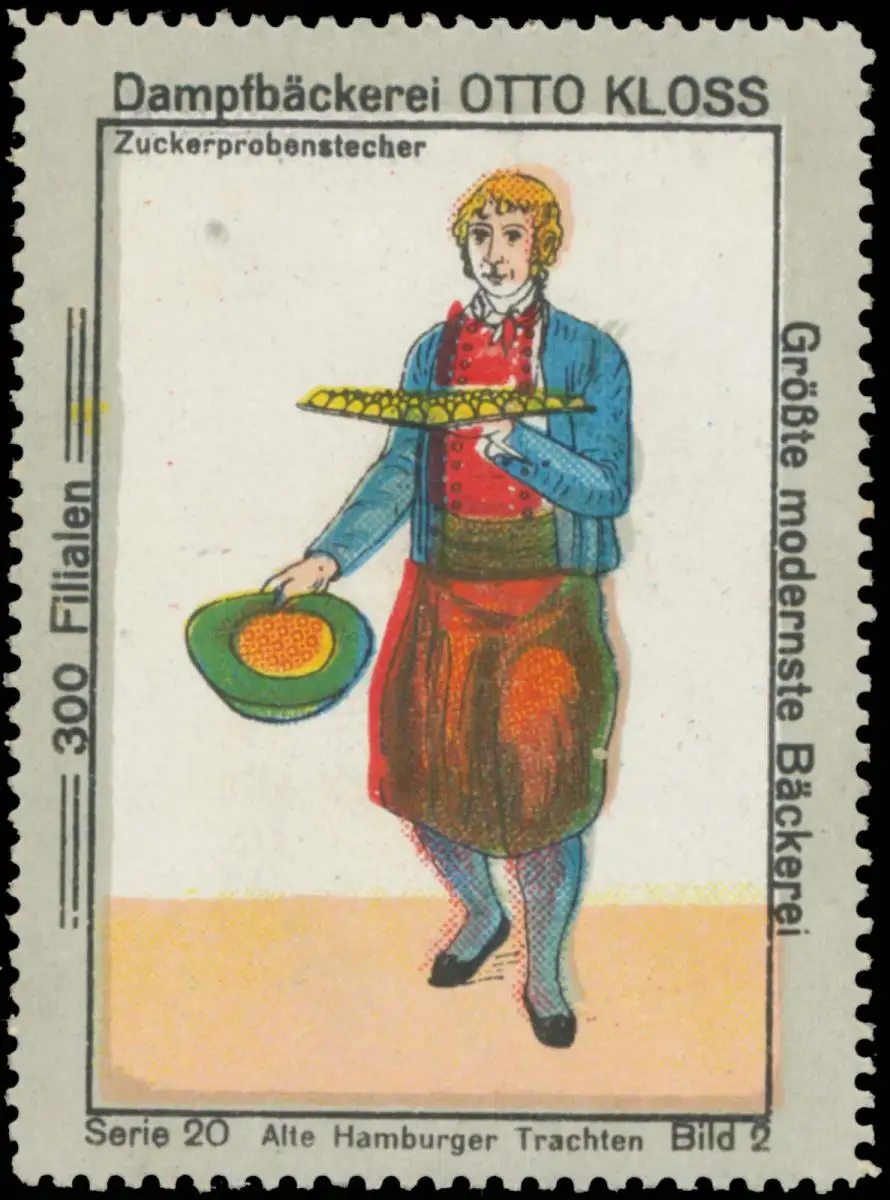 Dampfbäckerei, 300 Filialen, Serie 20 Alte Hamburger Trachten, Bild 2, Größe/Zustand: 6x4 , Fehldruck, guter Zustand, Original alte Reklamemarke die seinerzeit für die Werbung benutzt wurde