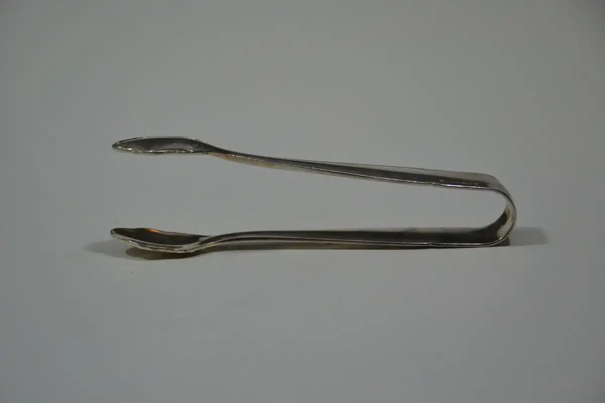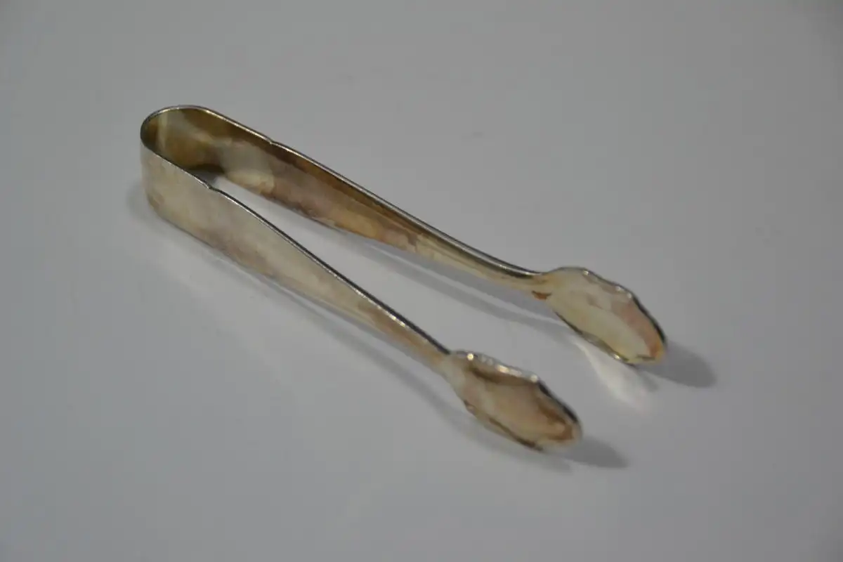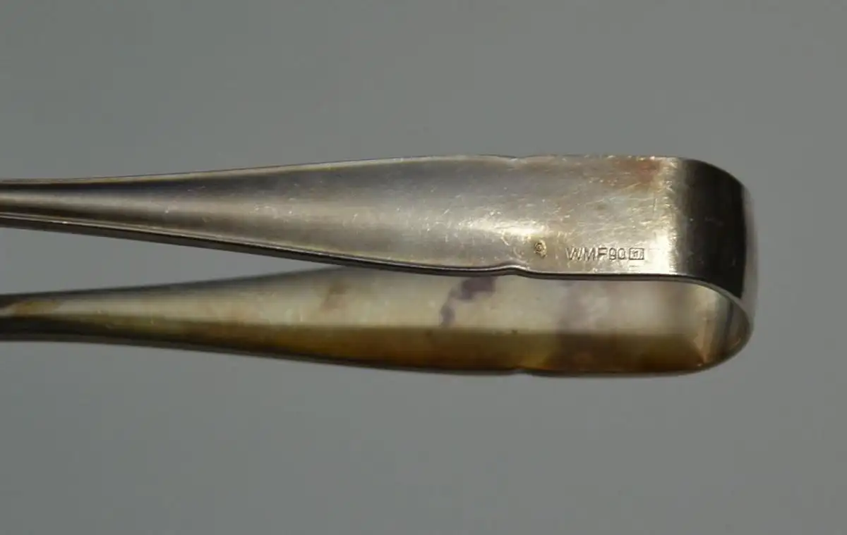 Zuckerzange, versilbert, Hersteller WMF, Gravur am Griff: "WMF 90 1".