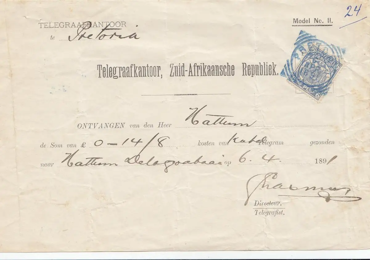 Zuid-Afrikaansche Republick - Telegram Ontvangen 1891 Pretoria