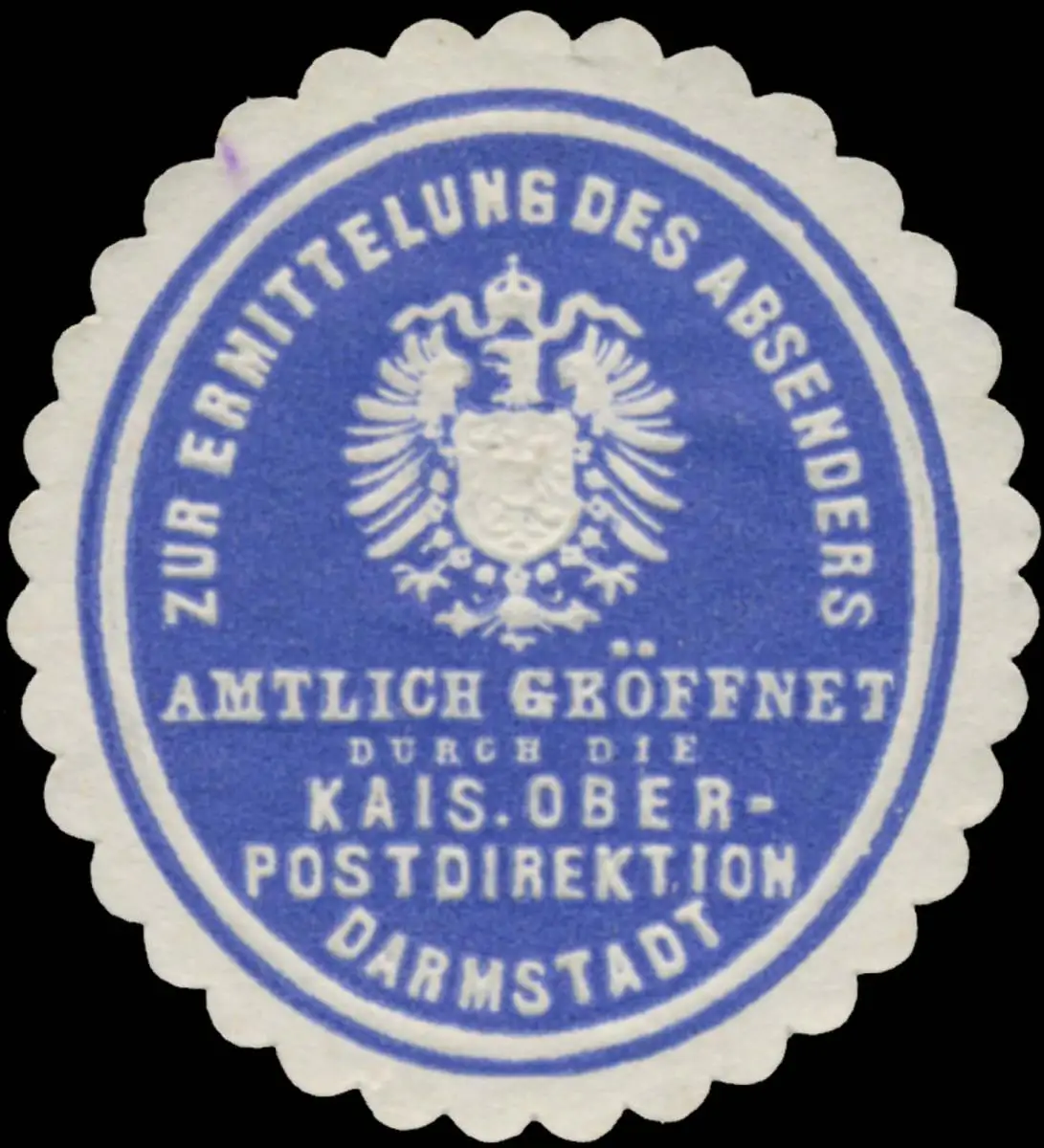 Zur Ermittlung des Absenders amtlich geöffnet durch die Kais. Oberpostdirektion Darmstadt
