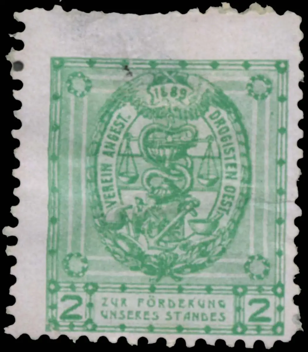 Spendenmarke, Drogerie, grün, Druck: Carl Jensen & Schwidernoch, Wien, Größe/Zustand: 3x2 , beschädigt, Original alte Reklamemarke die seinerzeit für die Werbung benutzt wurde