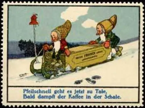 Pfeilschnell geht es jetzt zu Tale. Bald dampft der Kaffee in der Schale., Größe/Zustand: 4x6 , guter Zustand, Original alte Reklamemarke die seinerzeit für die Werbung benutzt wurde