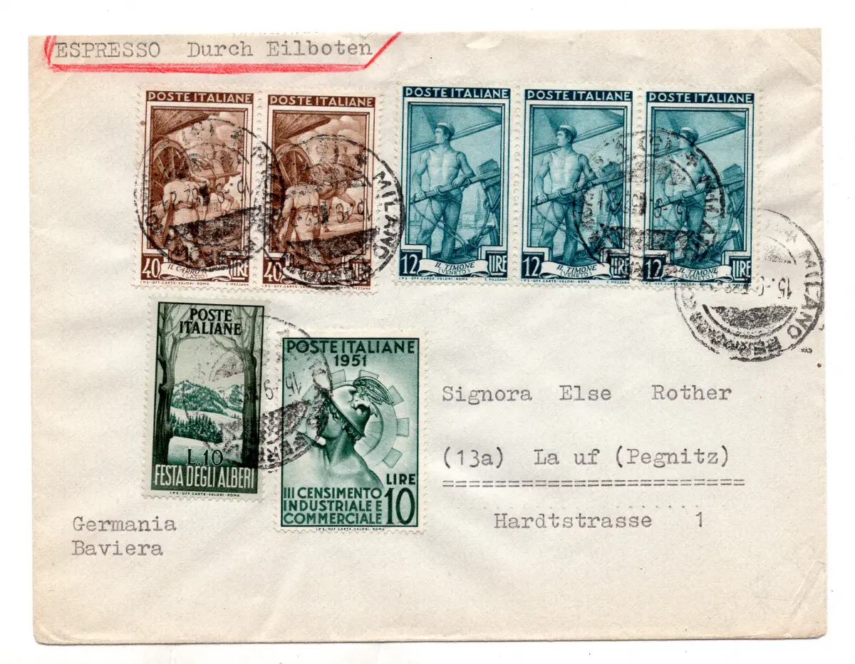 - Zwillingswerte - Bäume Lire 10 Nr. 680 + Ergänzungen Nr. 640 x 3 + 646 x 2 + 675 auf Umschlag exp. für Deutschland am 15.9.52 - Ungewöhnliche Nr. 686/19