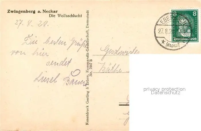 Zwingenberg_Neckar Die Wolfsschlucht Zwingenberg Neckar postalisch gelaufen 1928 Erhaltung siehe scans [WerneD78] WernPID7