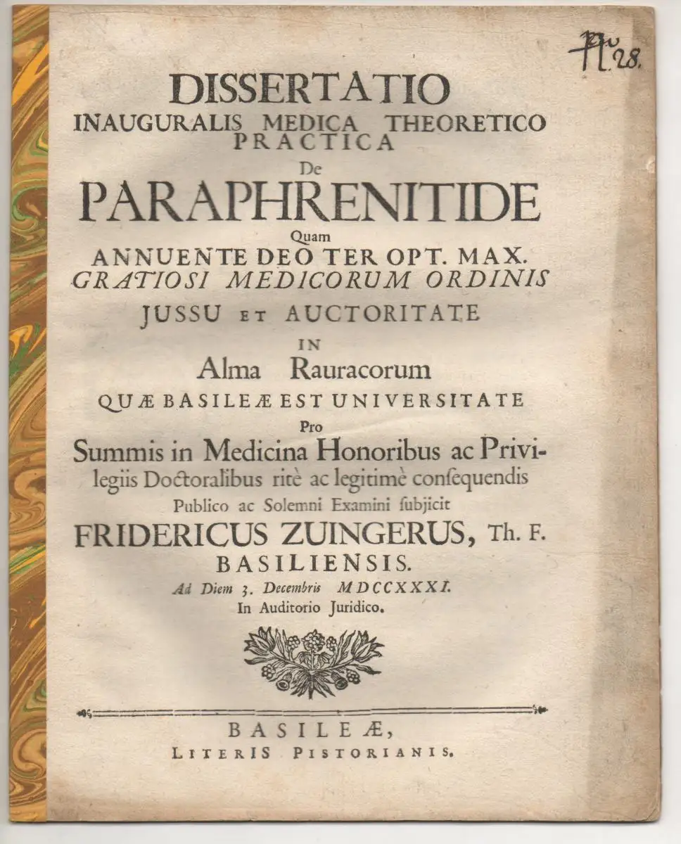 Zwinger, Friedrich: aus Basel: Medizinische Inaugural-Dissertation. De paraphrenitide.