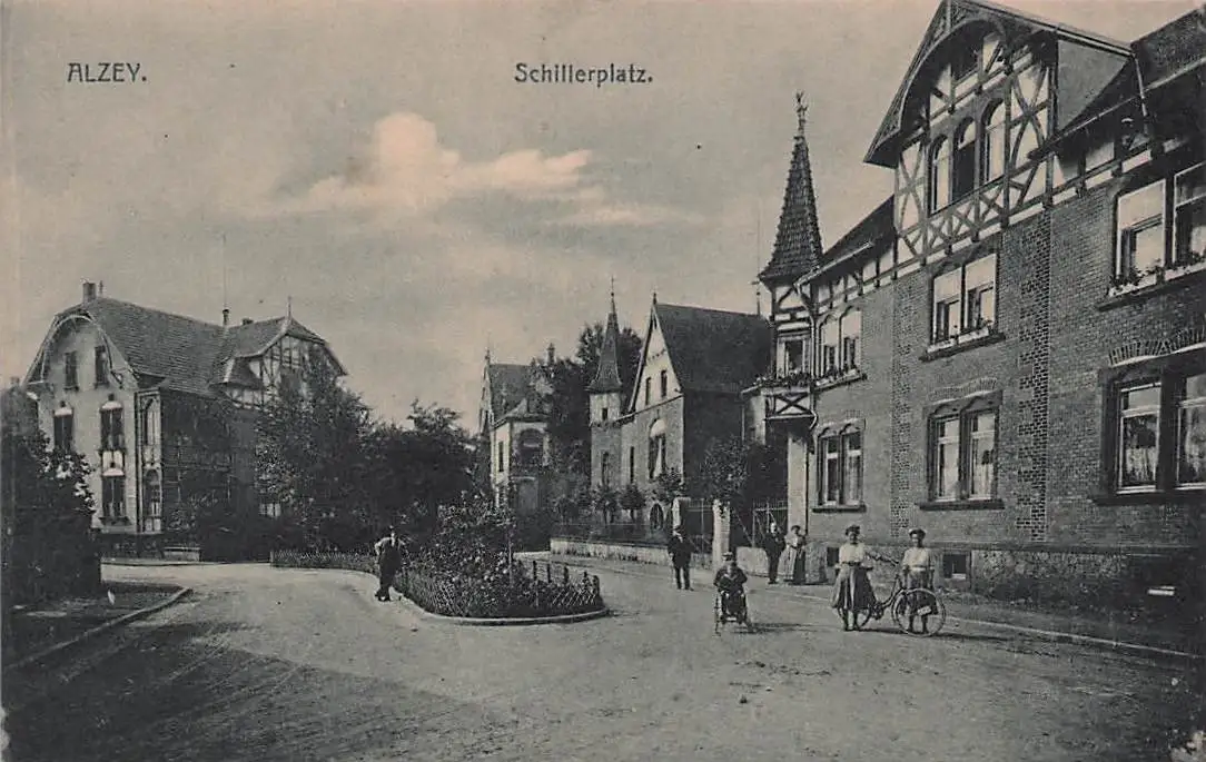 alte orig. AK Alzey Am Schillerplatz 1919, Karte ist ungelaufen, beschrieben, geringe Alters- u. Gebrauchsspuren.