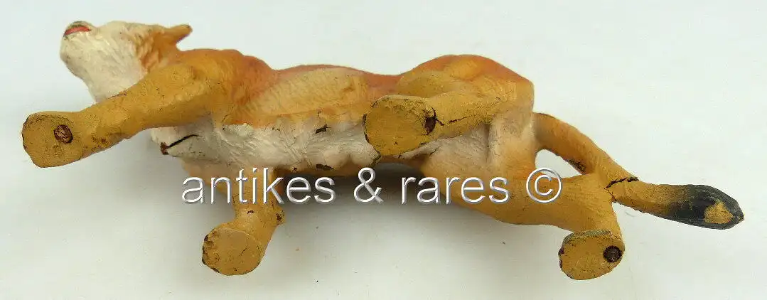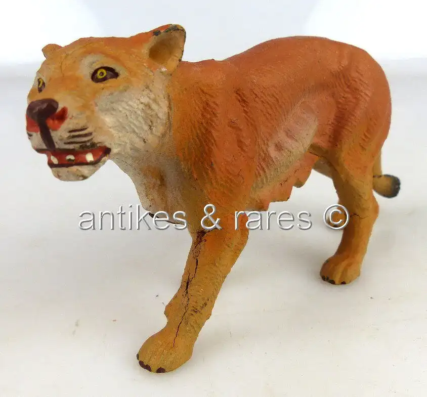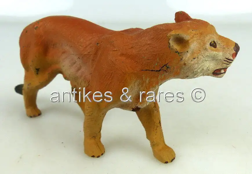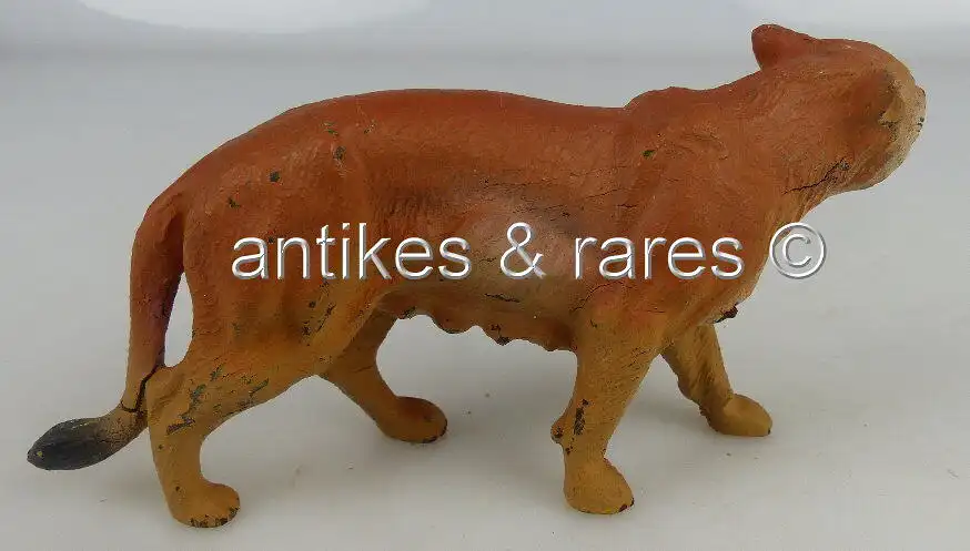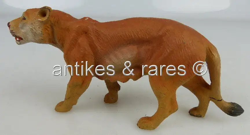 Herzlich Willkommen Gern können Sie auch in meine anderen Auktionen reinschauen. Viel Spaß dabei Sie sehen hier auf ein original altes Elastolin Tier: Raubkatzer \nGröße ca.: 13 x 2,5 x 6,5 cm Das Elastolintier ist im bespielten, gebrauchten Zustand und ist nicht geputzt oder gereinigt worden. Die Raubkatzer hat am Hals, am Rücken, am Schwanz und an den Beinen Einrisse. Bitte sehen Sie sich die Fotos zum Zustand des Artikels/der Artikel an, da diese Bestandteil der Auktion sind (siehe Foto oben).