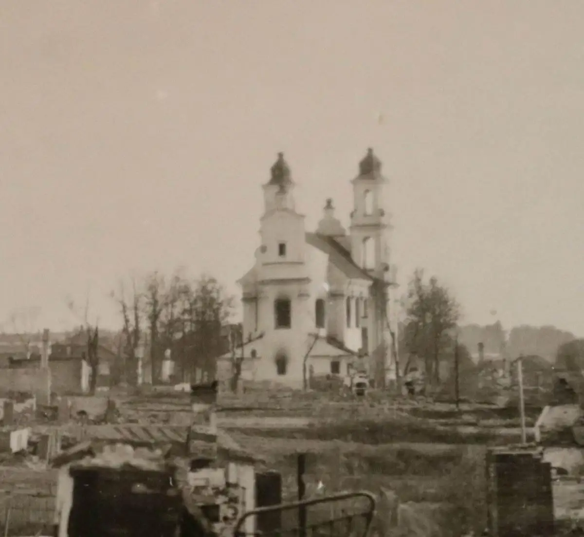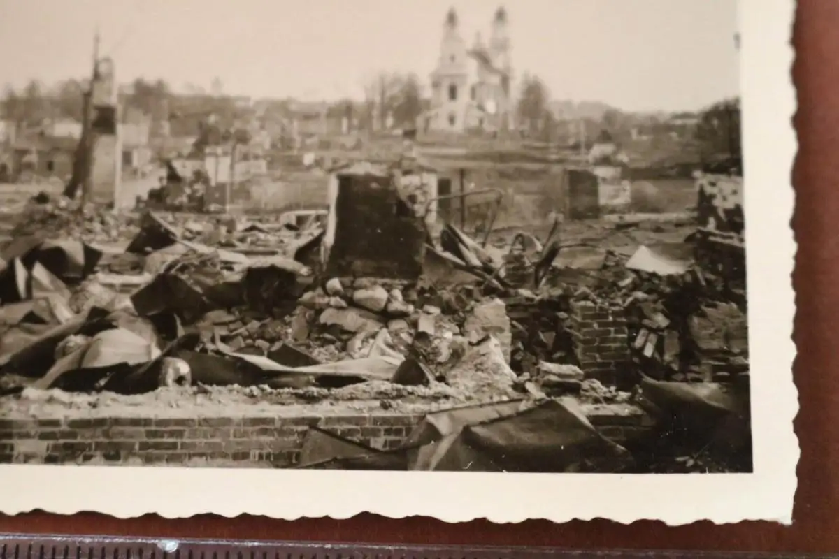 Biete hier ein altes Foto zerstörte Stadt - Hintergrund eine Kirche mit zwei Türmen - Ort ?? an