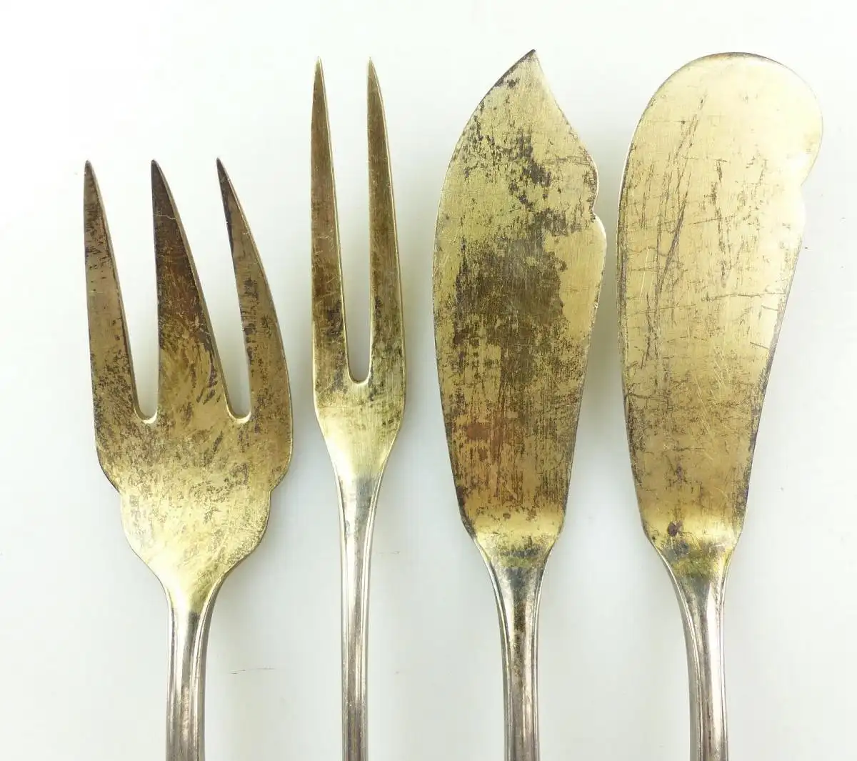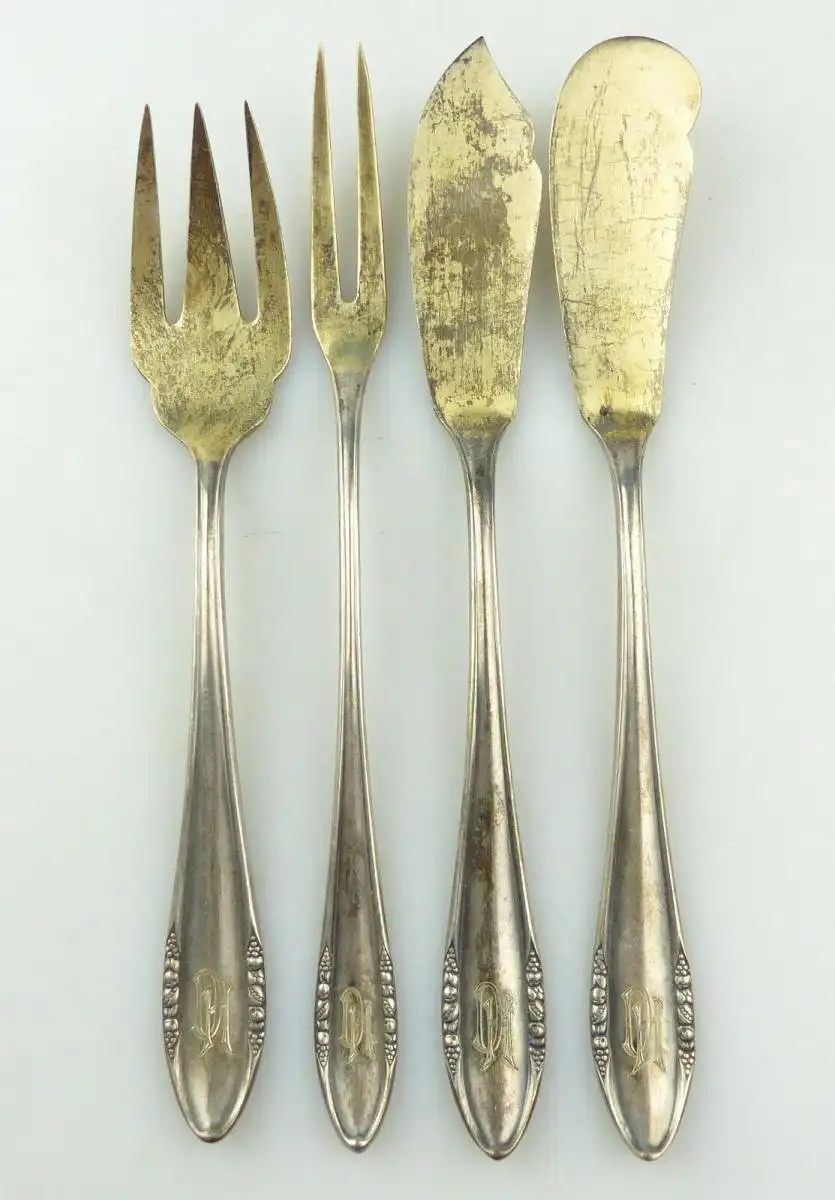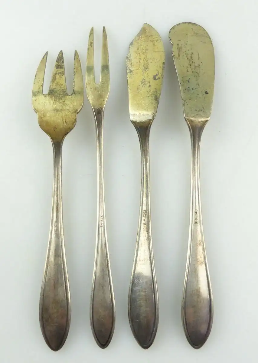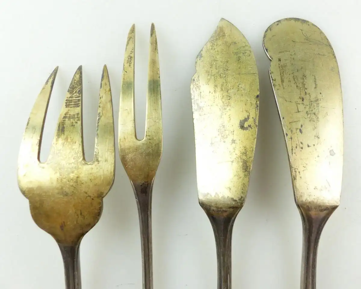 Die Besteckteile sind i gebrauchten Zustand mit Gebrauchsspuren, kleinen Kratzern und Verschmutzungen, siehe Fotos. Die Vergoldung ist deutlich zerkratzt / abgenutzt.