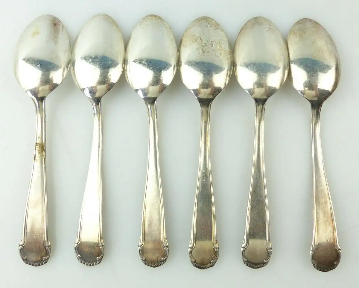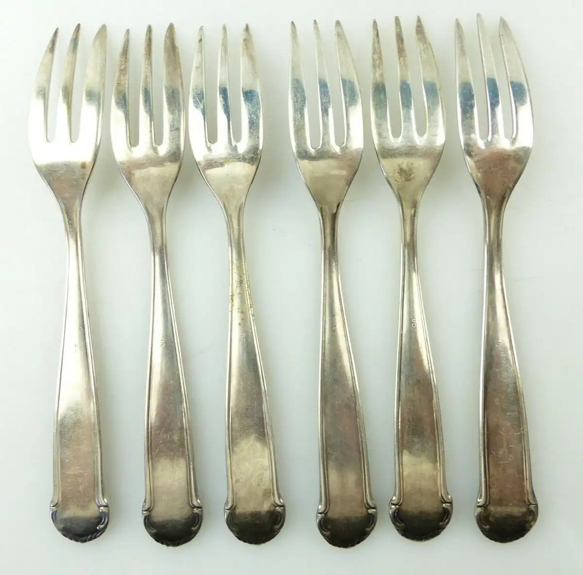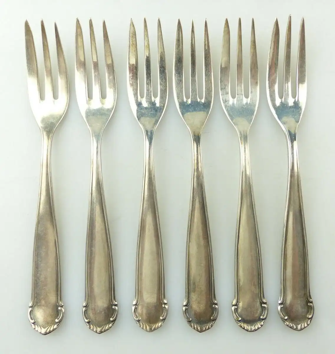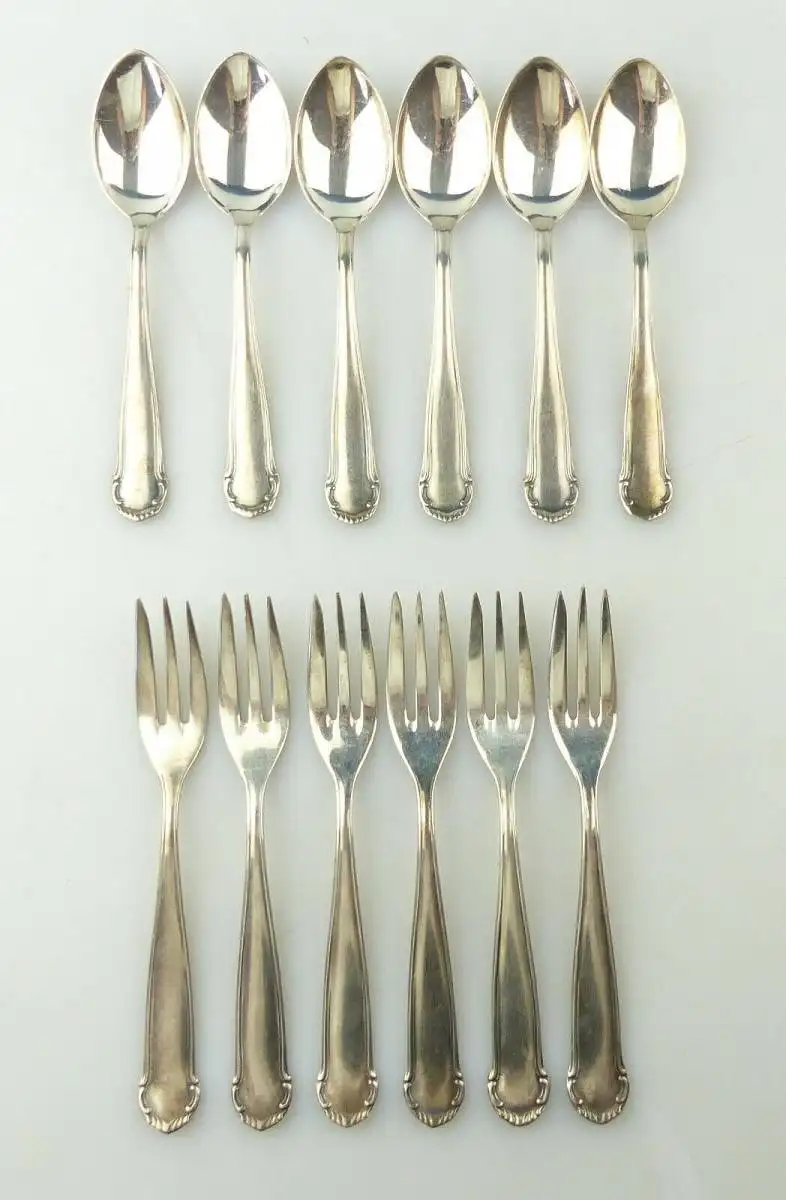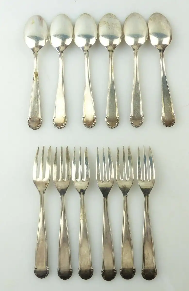 Herzlich Willkommen Gern können Sie auch in meine anderen Auktionen reinschauen. Viel Spaß dabei 6 versilberte Kaffeelöffel und 6 versilberte Kuchengabeln Länge der Kuchengabeln ca.: 15 cm Länge der Kaffeelöffel ca.: 13,6 cm Feingehalt Silber (Ag): 90 Silberauflage Gewicht zusammen ca.: 293 g Das Besteck ist im guten gebrauchten Zustand mit leichten Gebrauchsspuren, kleinen Kratzern und Verschmutzungen, siehe Fotos. Das Besteck ist nicht geputzt oder geschönt worden. Bitte schauen Sie sich die Fotos zum Zustand des Artikels an, da diese Bestandteil der Beschreibung sind.