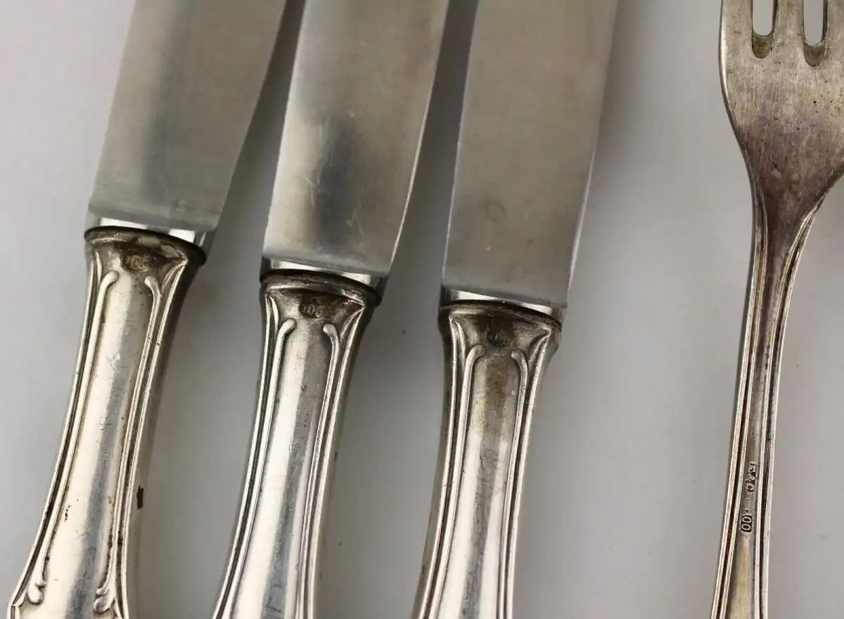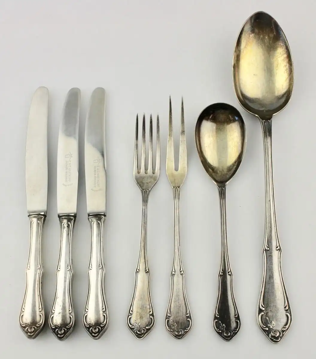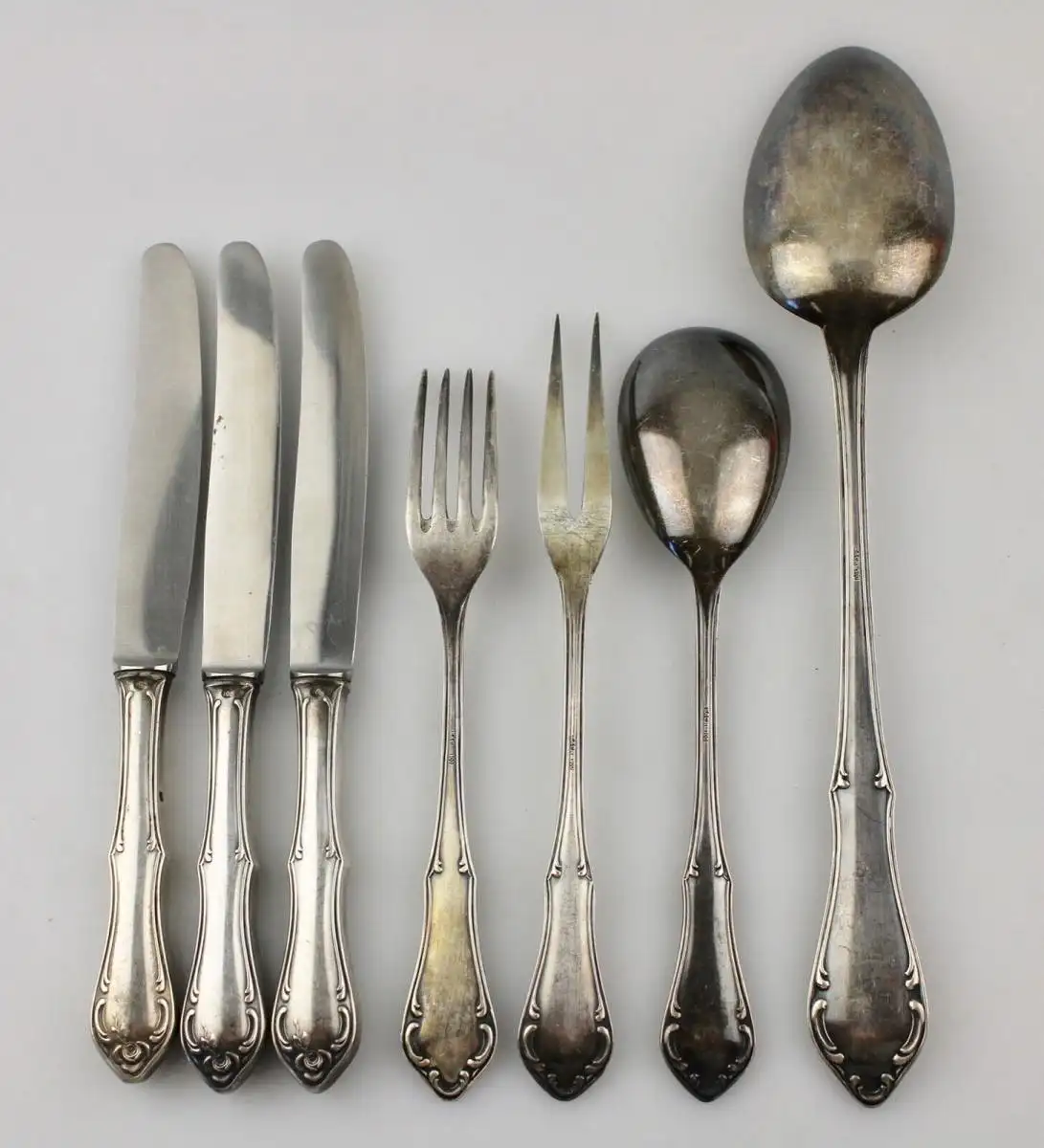 Herzlich Willkommen Gern können Sie auch in meine anderen Auktionen reinschauen. Viel Spaß dabei 7 Teile E und C Hartkopf Besteck mit Rose Größe der Gabel ca.: 17,8 x 2,2 cm Größe der Vorlegegabel ca.: 19,3 x 1,7 cm Größe der Messer ca.: 21 x 1,8 cm Größe des Vorlegelöffels ca.: 19 x 4,3 cm Größe des Vorlegelöffels (groß) ca.: 27 x 5,2 cm Stempelung: E.u.C.h 100 Feingehalt Silber (Ag): 100 in Auflage Gewicht komplett ca.: 450 g Das Besteck ist im guten gebrauchten Zustand mit Verschmutzungen, kleinen Kratzern und Gebrauchsspuren, siehe Fotos. Der Artikel ist nicht gereinigt, geputzt oder geschönt worden. Bitte schauen Sie sich die Fotos zum Zustand des Artikels an, da diese Bestandteil der Beschreibung sind.