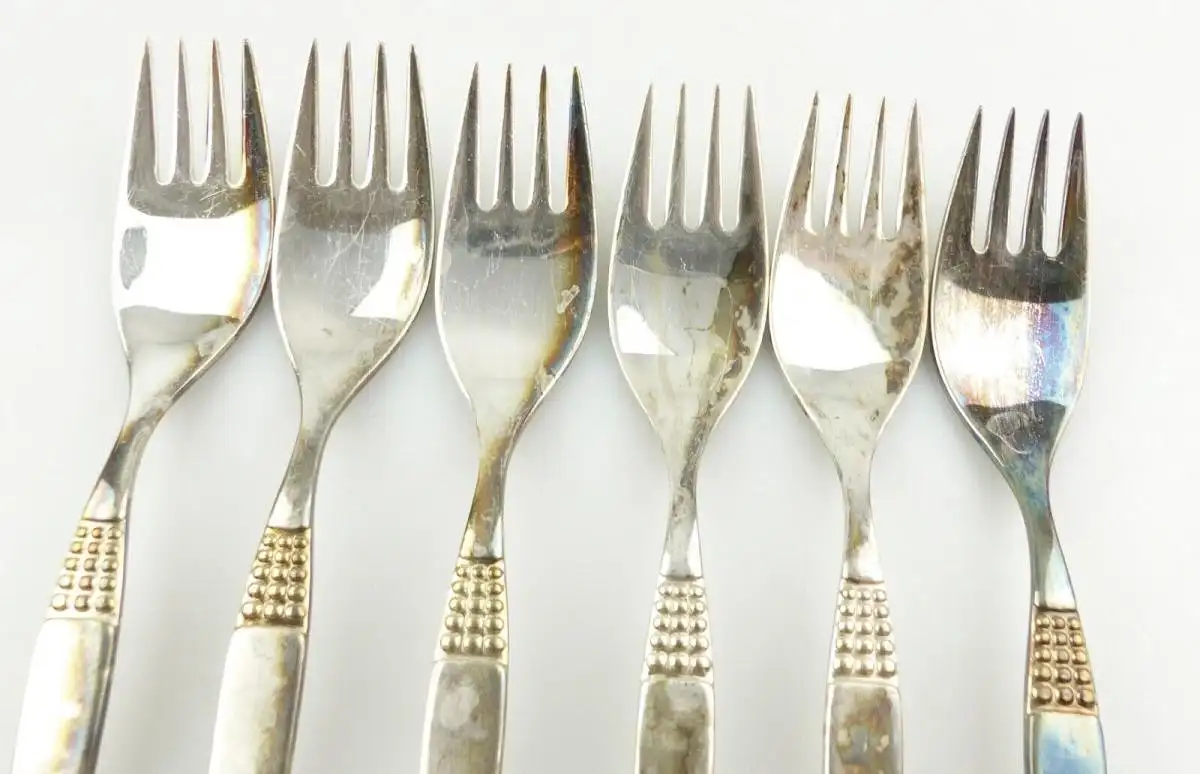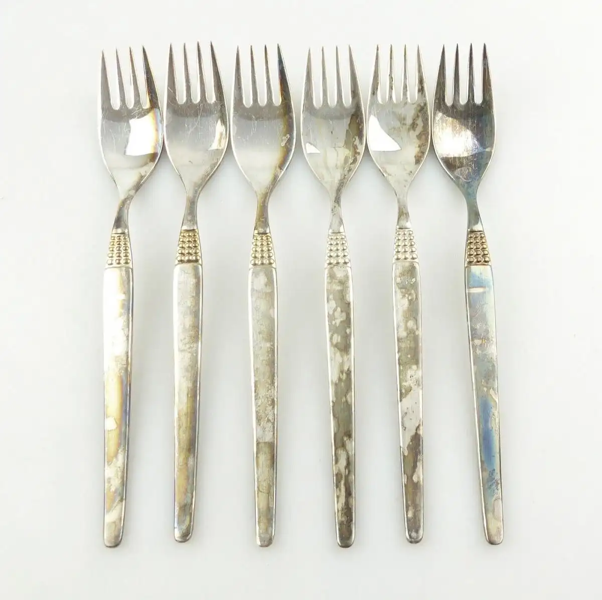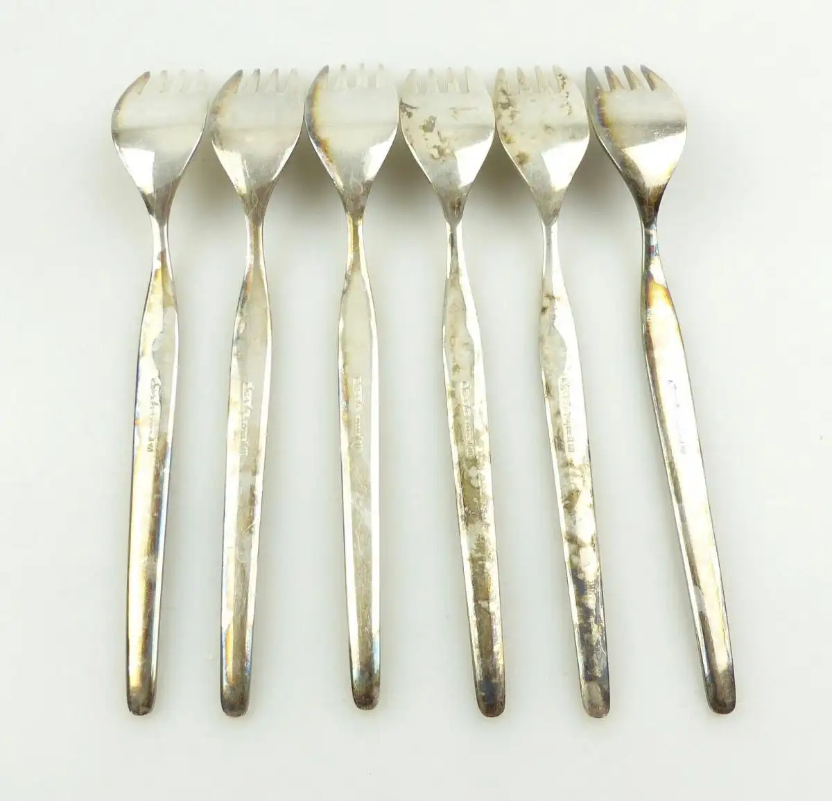 Herzlich Willkommen - Gern können Sie auch in meine anderen Auktionen reinschauen. Viel Spaß dabei - 6 versilberte Gabeln Drache Besteck Größe jeweils ca.: 19,6 x 2,7 cm Gewicht zusammen ca.: 260 g Stempelung: Drache suprasil 100 Feingehalt Silber: 100 in Auflage Die Löffel sind im guten gebrauchten Zustand mit leichten Gebrauchsspuren, kleinen Kratzern und Verschmutzungen, stark angelaufen, siehe Fotos. Der Artikel ist nicht gereinigt, geputzt oder geschönt worden. Bitte schauen Sie sich die Fotos zum Zustand des Artikels an, da diese Bestandteil der Beschreibung sind.