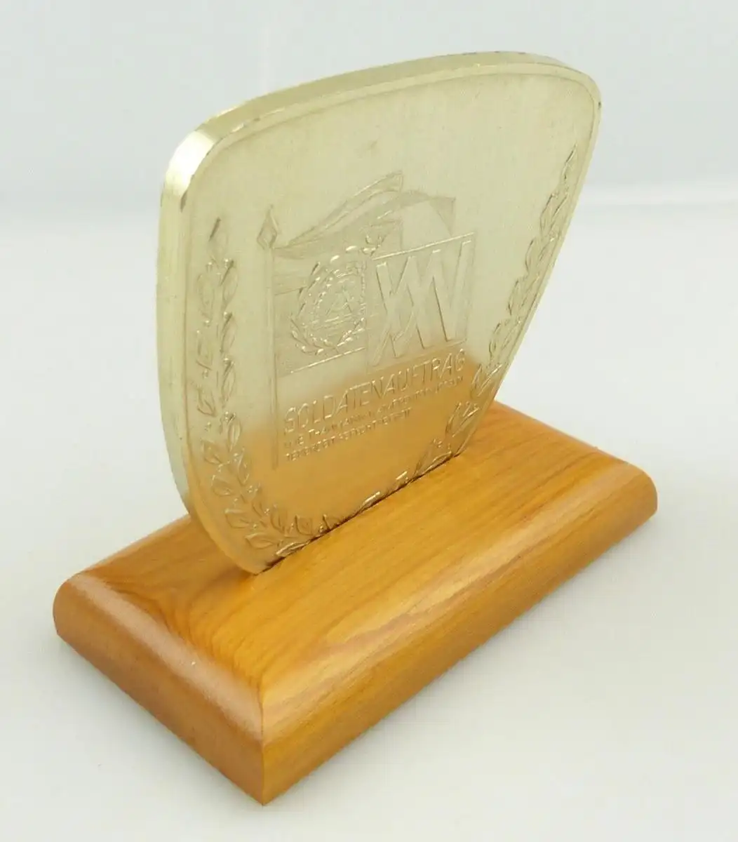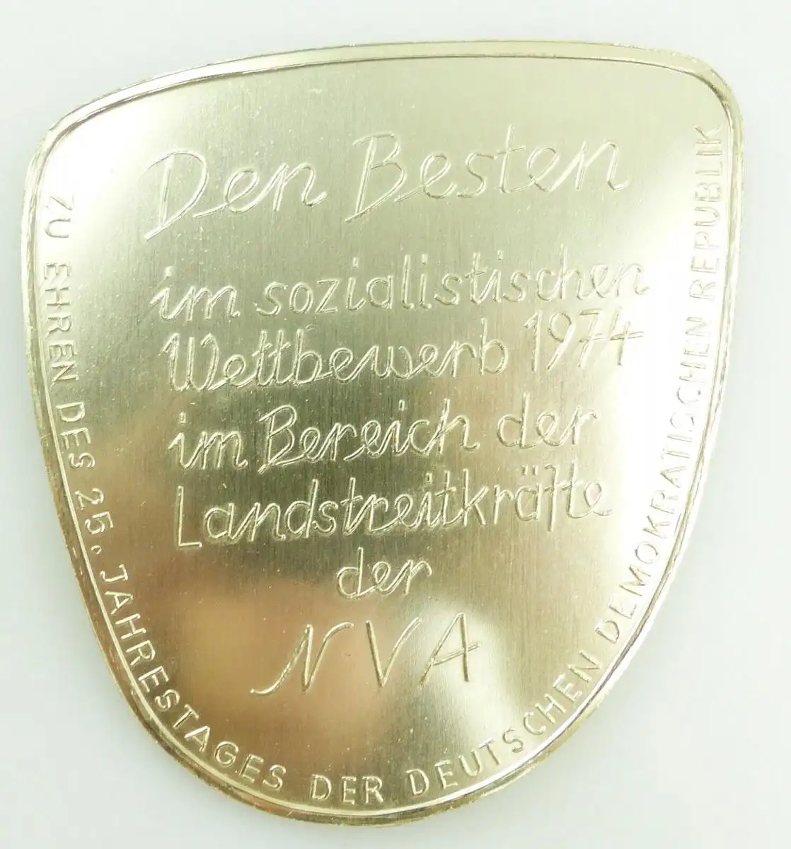 Herzlich Willkommen - Gern können Sie auch in meine anderen Auktionen reinschauen. Viel Spaß dabei - Original altes Ehrengeschenk zu Ehren des 25. Jahrestages der DDR Den Besten im sozialistischen Wettbewerb 1974 im Bereich der Landstreitkräfte der NVA Durchmesser der Plakette ca.: 60 mm Größe des Fußes ca.: 11,7 x 6,7 cm Das Ehrengeschenk ist im guten gebrauchten Zustand mit Gebrauchsspuren und leichten Verschmutzungen, siehe Fotos. Der Artikel ist nicht gereinigt, geputzt oder geschönt worden. Bitte schauen Sie sich die Fotos zum Zustand des Artikels an, da diese Bestandteil der Beschreibung sind.